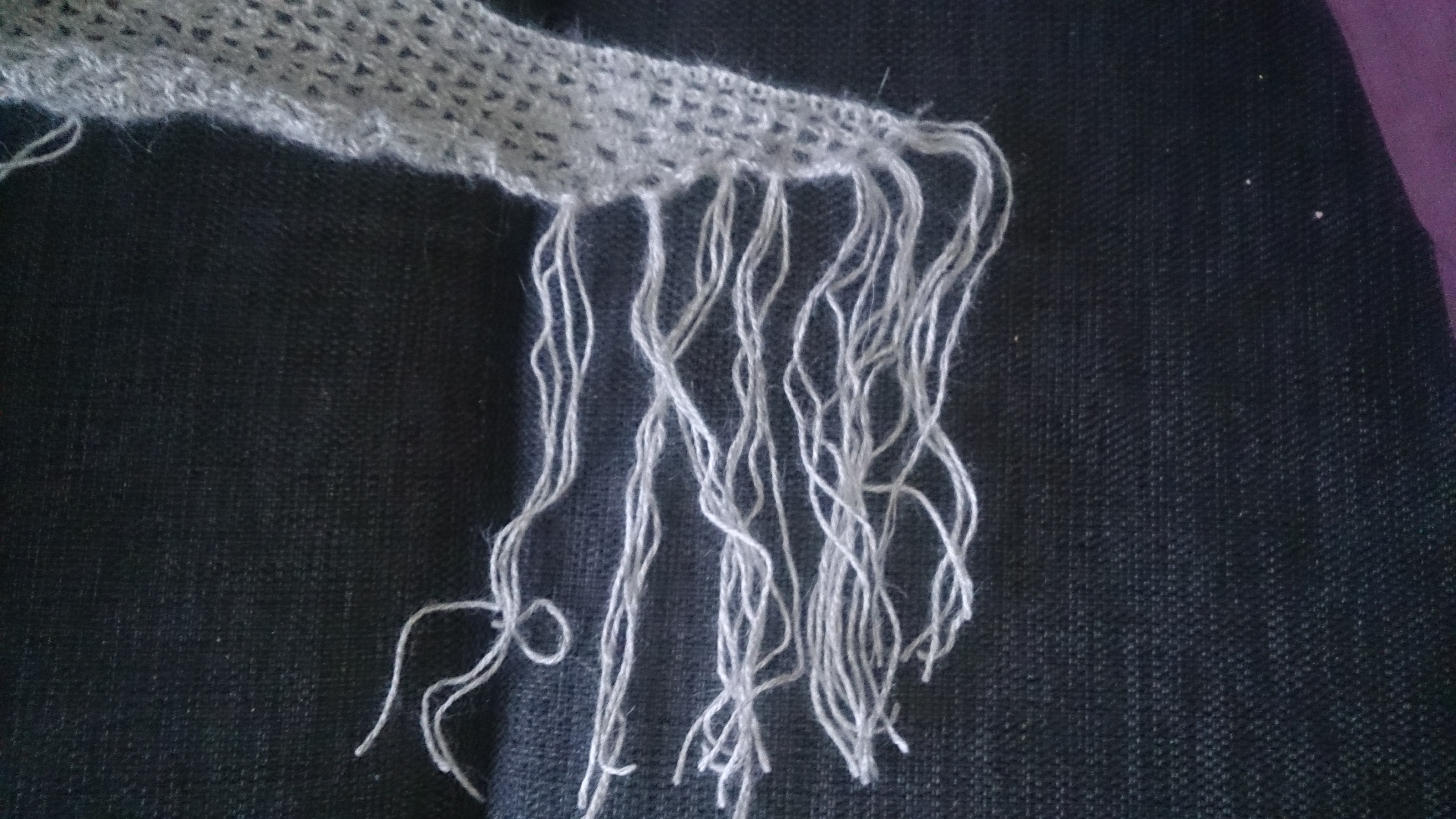 Montering: Startet med å feste alle trådene. Der etter festet jeg til frynser på «katetene», ikke den rette siden De på det ferdige resultatet Det er disse frynsene som gjør trekantsjalet fint. Det er en smakssak hvor lange disse bør være, og hvor stort mellomrom det burde være mellom hver enkelt. Mine er 20 cm lange, som betyr at jeg tok dobbel tråd på ville utgjøre fire tråder på hver 20 cm. Jeg målte med et målebånd og klippet nøyaktig før jeg satte de på trekantsjalet. Slik monterte jeg en frynse: