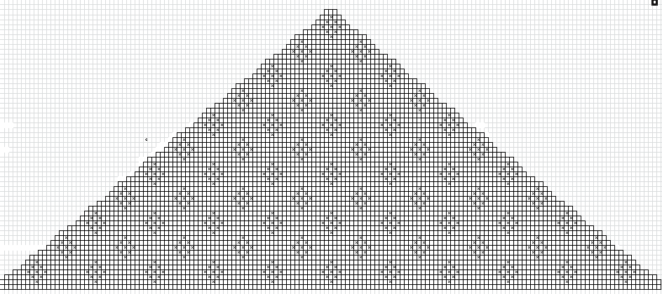 For å finne ut hvor stor dette trekantsjalet skulle være har jeg prøvd meg litt frem. Sjalet måler i starten 154 cm. Det strås veldig fort inn og er 54 cm høy. Det at det skrås fort inn er også noe som gjør dette trekantsjalet fint. Garnet jeg benyttet var Alpakka garn fra Nille som er av utsøkt kvalitet både når det gjelder utseende og passform. Det gikk med 4 nøster til dette trekantsjalet. Det går med nesten et halvt nøste til frynsene. Det går fint an å bruke andre garntyper. Da må en bare tilpasse slik at bredden på sjalet blir noenlunde lik. Det er bare å prøve seg frem. Jeg brukte heklenål nr. 3. Selve heklingen: Her er heklingen basert på filethekling. Dette betyr at enten er det er hull hvor det hekles kun to luftmasker mellom to staver, eller hullet fylles inn med to staver. I mellom disse hekles det en stav. Slik er det fullstendige mønsteret: