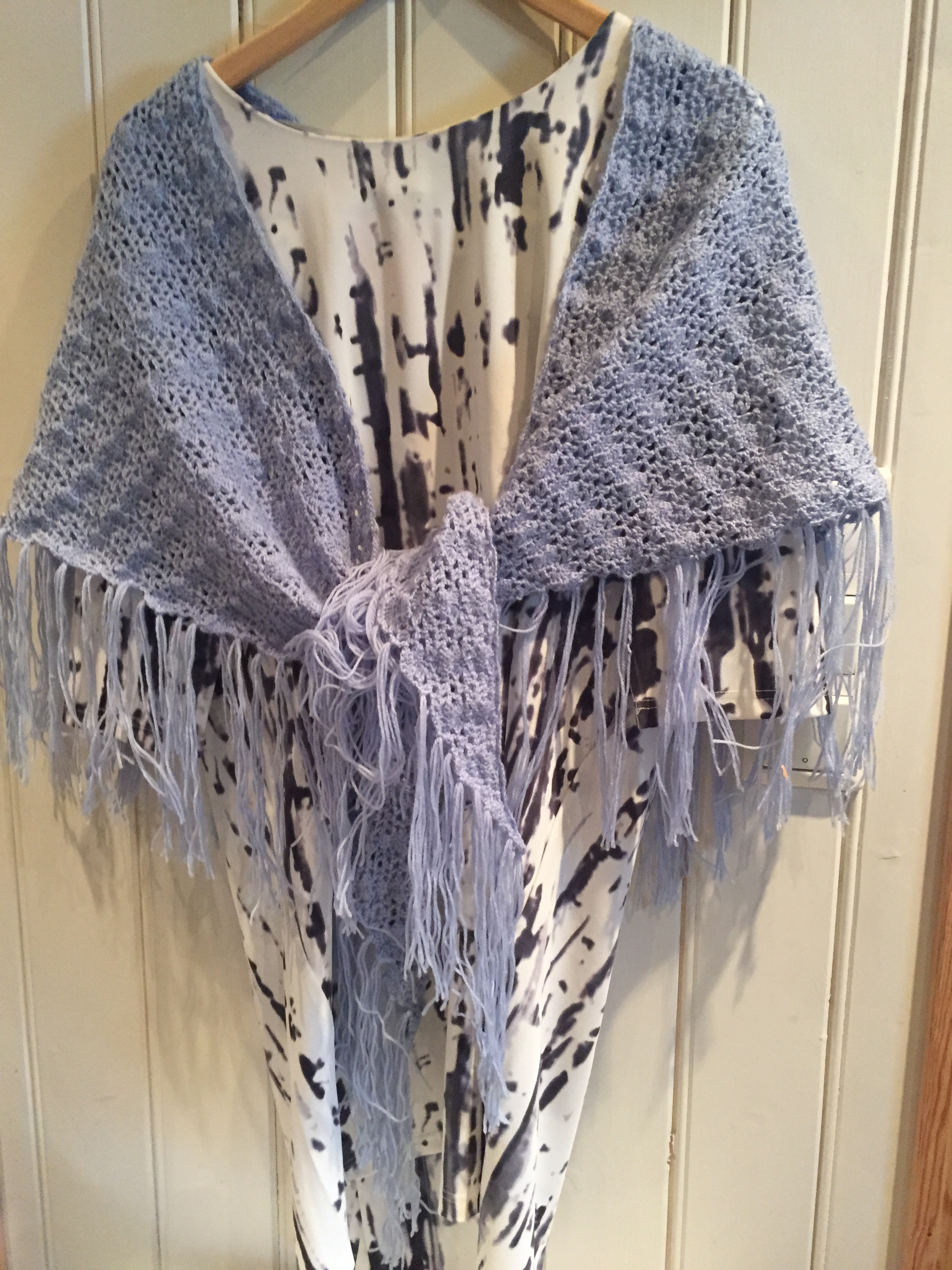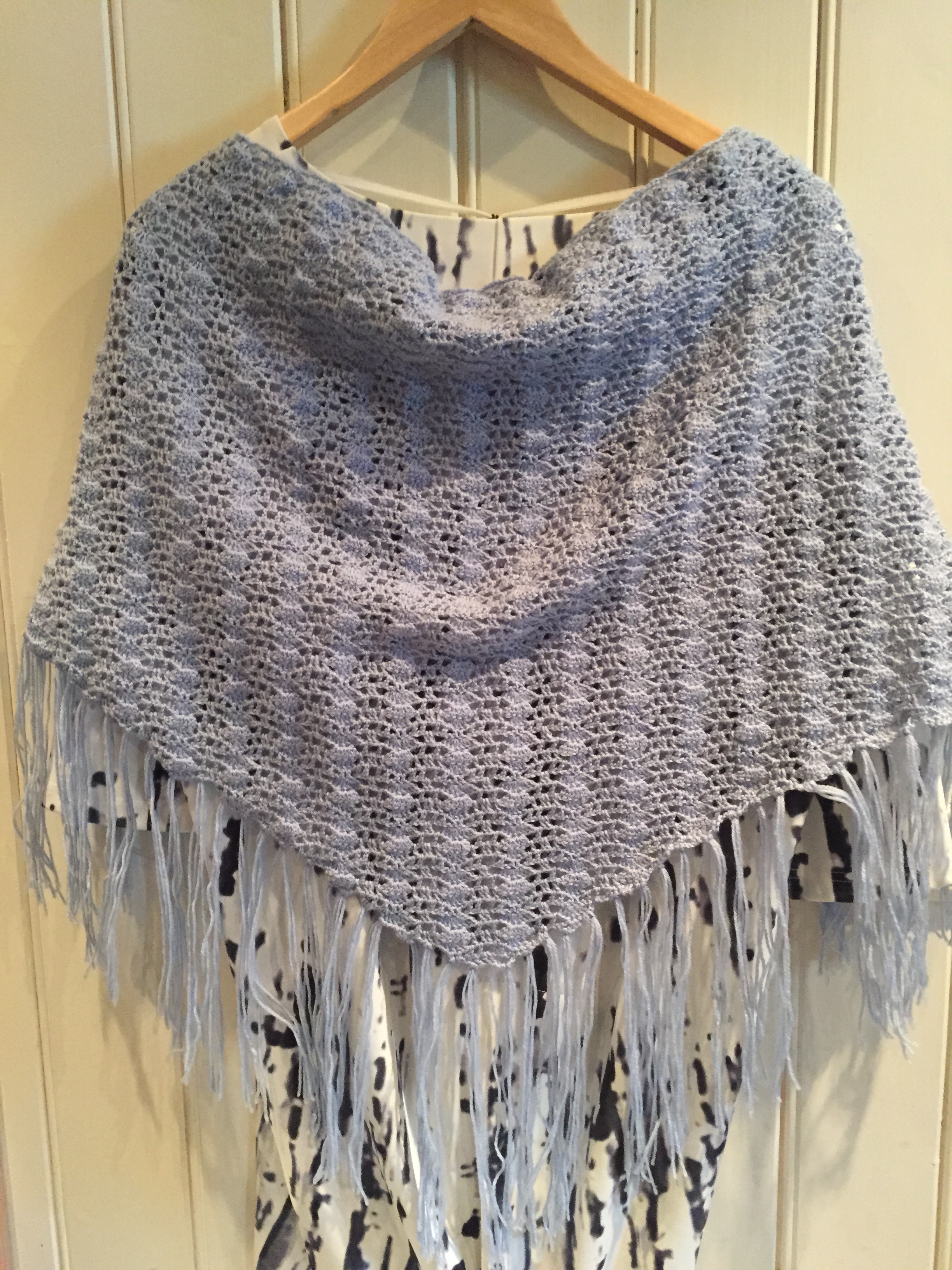 Denne sommeren er jeg invitert i bryllup og kjolen er kjøp inn. Jeg tenkte at jeg muligens skulle kjøpe en kort hvit jakke som matsjer, men det slå meg at jeg som «heklenerd» kunne designe et passende selskapssjal. Jeg synes det var vanskelig å finne farge på sjalet, med ente til slutt opp med lyseblått som er en somerlig farge. Når det gjaldt selve garnet prøvde jeg noe nytt, Babygarn 100 % merinoull fra Trysil kjøpt på Europris. Dette garnet er passe mykt og behagelig og egner seg godt til et sommerlig selskapssjal.