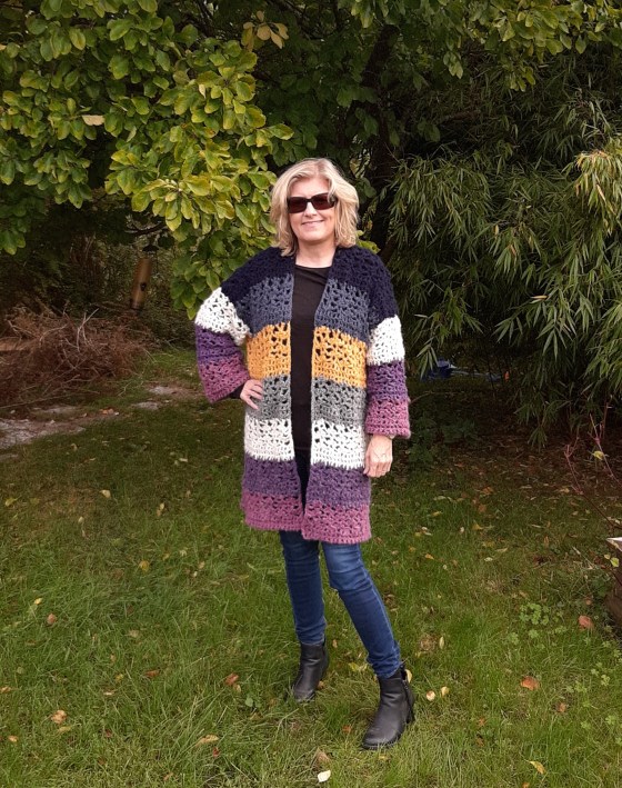 This time it was the yarn itself that made me want a new cardigan. Autumn is coming soon and a warm cardigan can be worn both indoors and outdoors. A cardigan fits most things.The jacket is crocheted in «Myk bris» from Europris and I crocheted in hook size 6,0. I have chosen five colors it is crocheted in one size, 38.. The jacket itself is 847 cm long and 130 wideHere is a picture of the finished jacket.