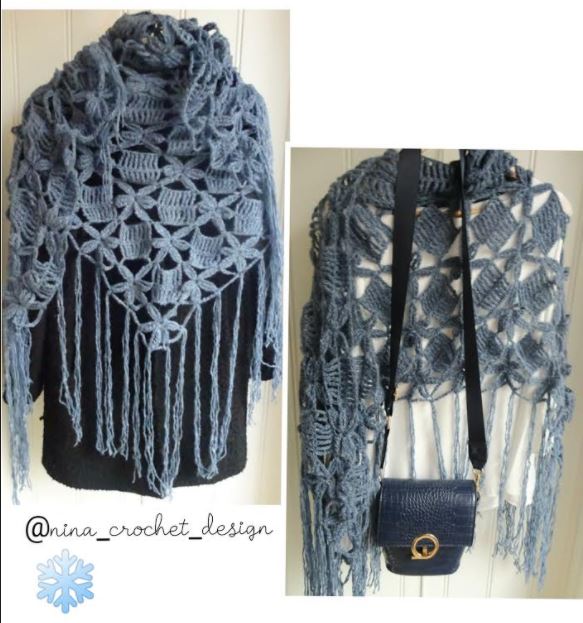I used crochet hook size 5, 0 The shawl measured 180 cm X 90 cm. The yarn I used is Air blowgarn form Trysilgarn. I went with 6 nets. And here’s a collage with a picture of the finished shawl:
