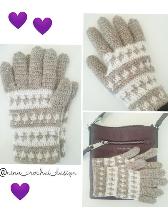 Now I continue to design cloves This is crocheted in treble crochet in two colors. This time I chose Drops called Flora. This has become my new favorite yarn. It is a beautiful yarn that fits perfectly with accessories that consist of 65% wool and 35% alpaca. It went with only 2 skeins. I used crochet hook no. 3.0. The coves is size small