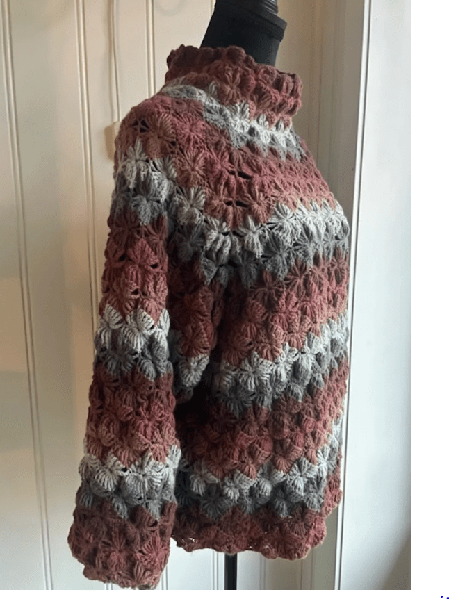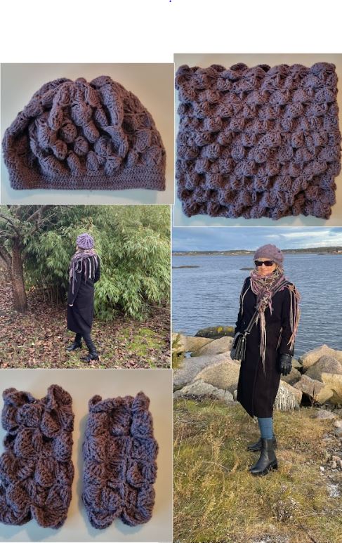 This winter I have crocheted quite a bit in bubble patterns and this time the challenge was a sweater. It took many attempts before the felling turned out nicely. a lot of yarn was used, 15 skeins. Denne vinteren har jeg heklet en del i boblemønster og denne gangen var utfordringen en genser. Det var mange forsøk før fellingen ble pent. Det gikk med masse garn, 15 nøster.