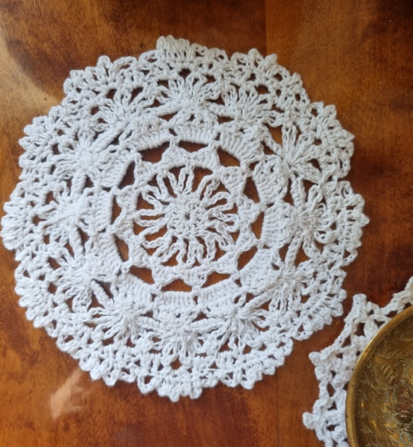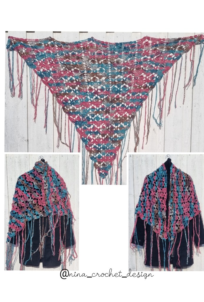 I got this beautiful yarn from a friend, it was bought at a market in Germany and has no label. It is possibly mostly cotton. I chose crochet hook no. 5.0 for this in this design. It will then have a more airy expression. The color is summery. Now I love big shawls and this is an oversized size. The pattern starts at the bottom and can be crocheted in the desired size. This triangular shawl is 180 cm wide and 112 cm high. In addition, I chose to crochet fringes that are 30 cm long. For the size I chose, 7 skeins worked. And here is a picture of the triangle shawl: here is a picture of the triangle shawl: