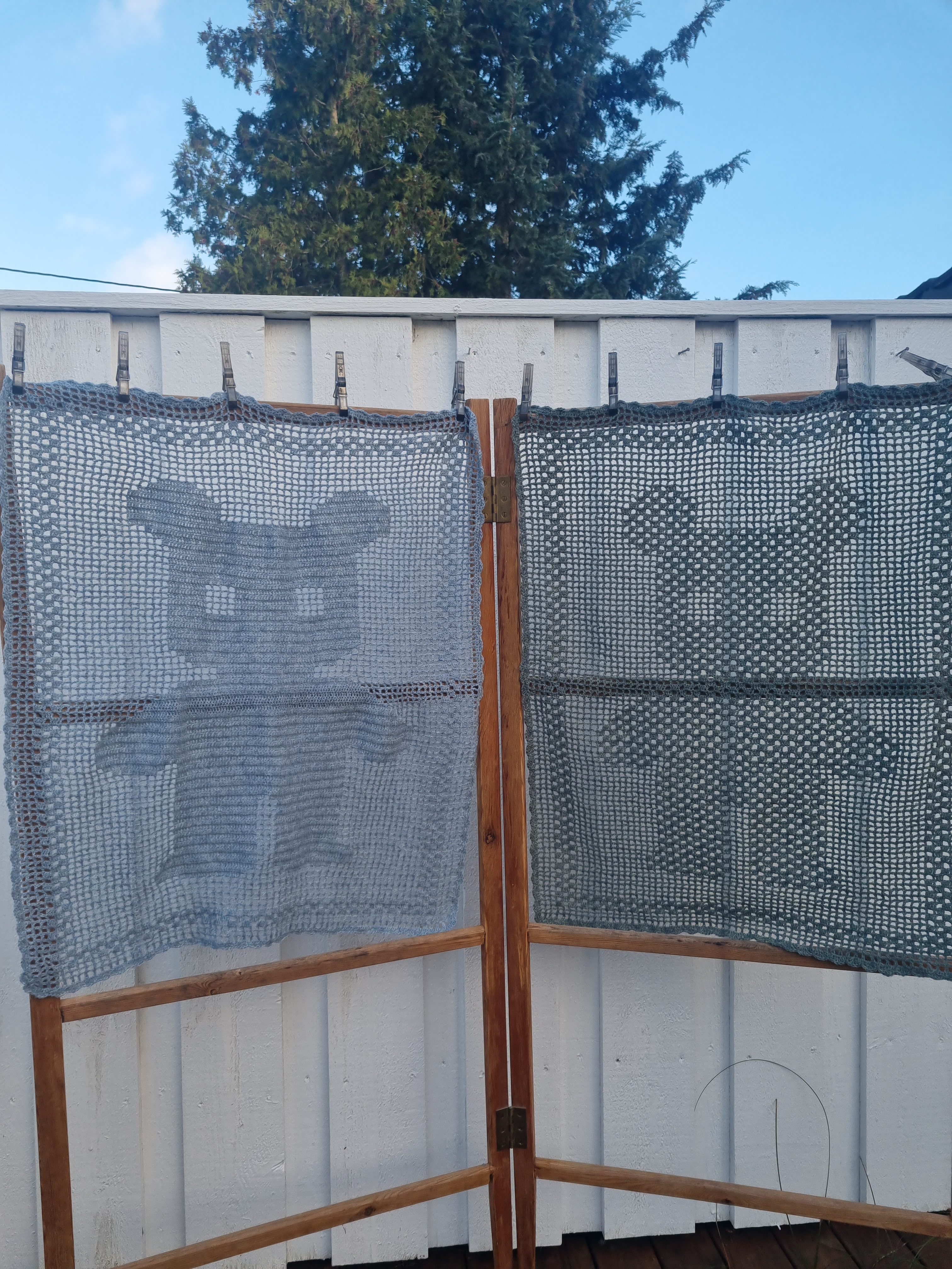 Her et bilde av det ferdige babyteppe og her kan dere hvordan størrelsen og mønsteret kommer frem (bamsen får den ære av å være med på bilde da den var modell for mønsteret):