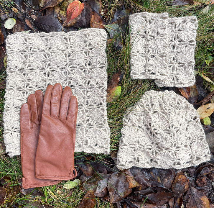 It’s always fun to crochet new accessories for the upcoming winter season. This time I have made a beanie, neckwarmer and wristwarmers in the same pattern.It is crocheted in one size.