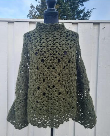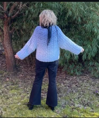 Nå har jeg designet mye tilbehør og interiørting. Nå begir jeg meg ut på ukjent farvann ved å designe en genser. En slik genser kan jeg bruke hele året. Siden den er noe gjennomsiktig er det viktig å tenke på hva som skal være under genseren når den skal brukes. Genseren er 73 cm lang. Den er heklet til meg og jeg bruker 38 i størrelse på overdeler.