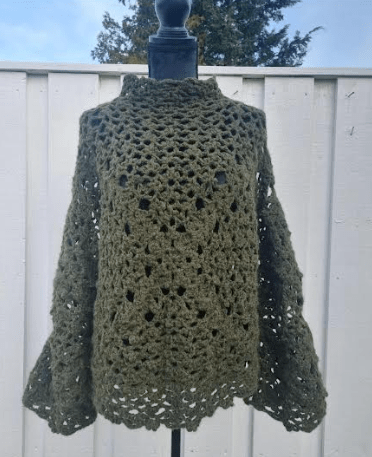 Heklet kort og vid genser i gittermønster i rektangulær fasong