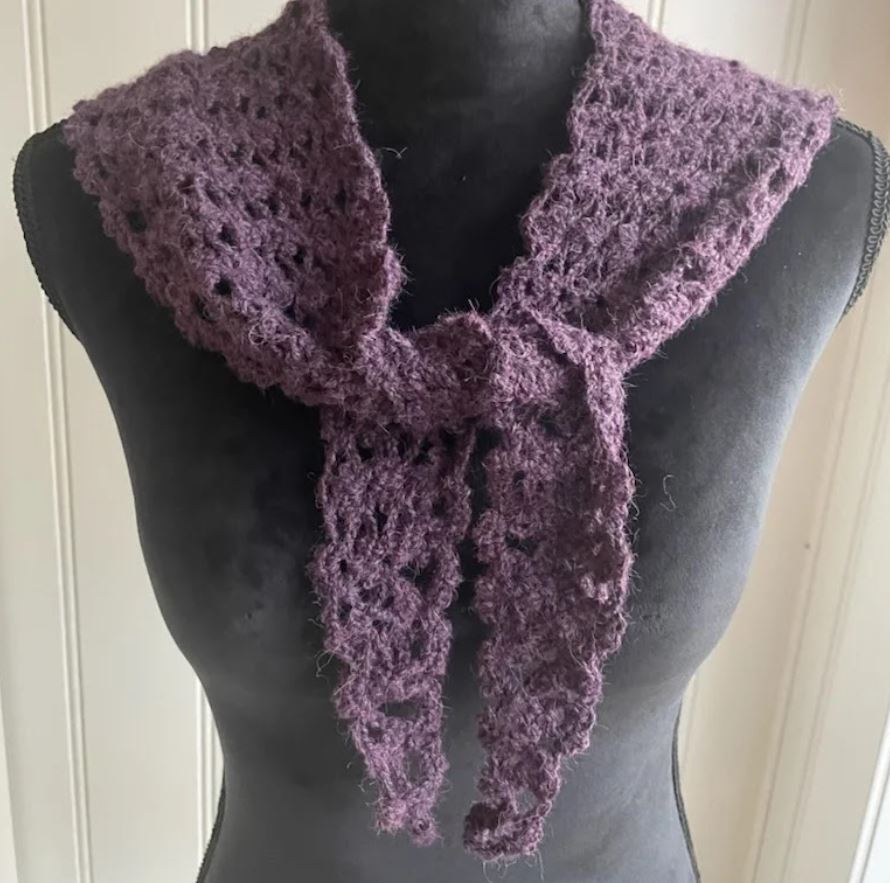 Det er blitt in med sjal som er veldig skrå og gjerne veldig små. Jeg har designet dette i to mønster, og her kommer det første. Det er ikke mye garn som går med. Jeg har heklet de både små og store og med og uten frynser. Mønsteret starter i bunnen og kan hekles i den størrelsen som ønskes. Hvilket som helst garn kan benyttes. Heklenålen avhenger av hvilket garn som brukes.