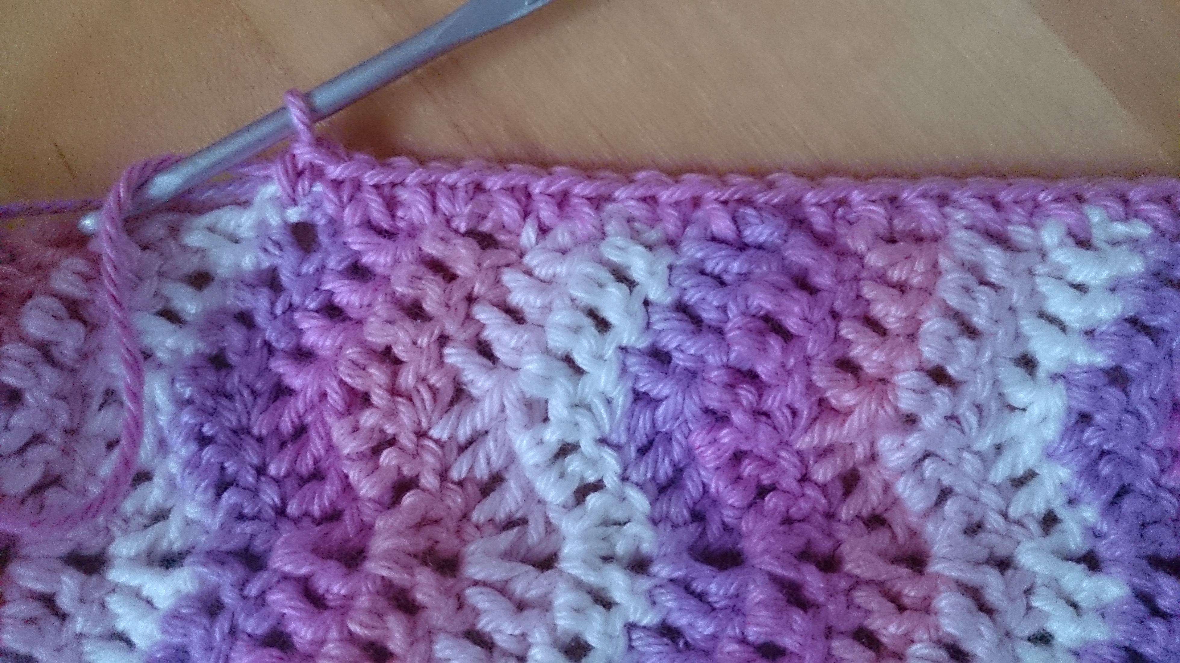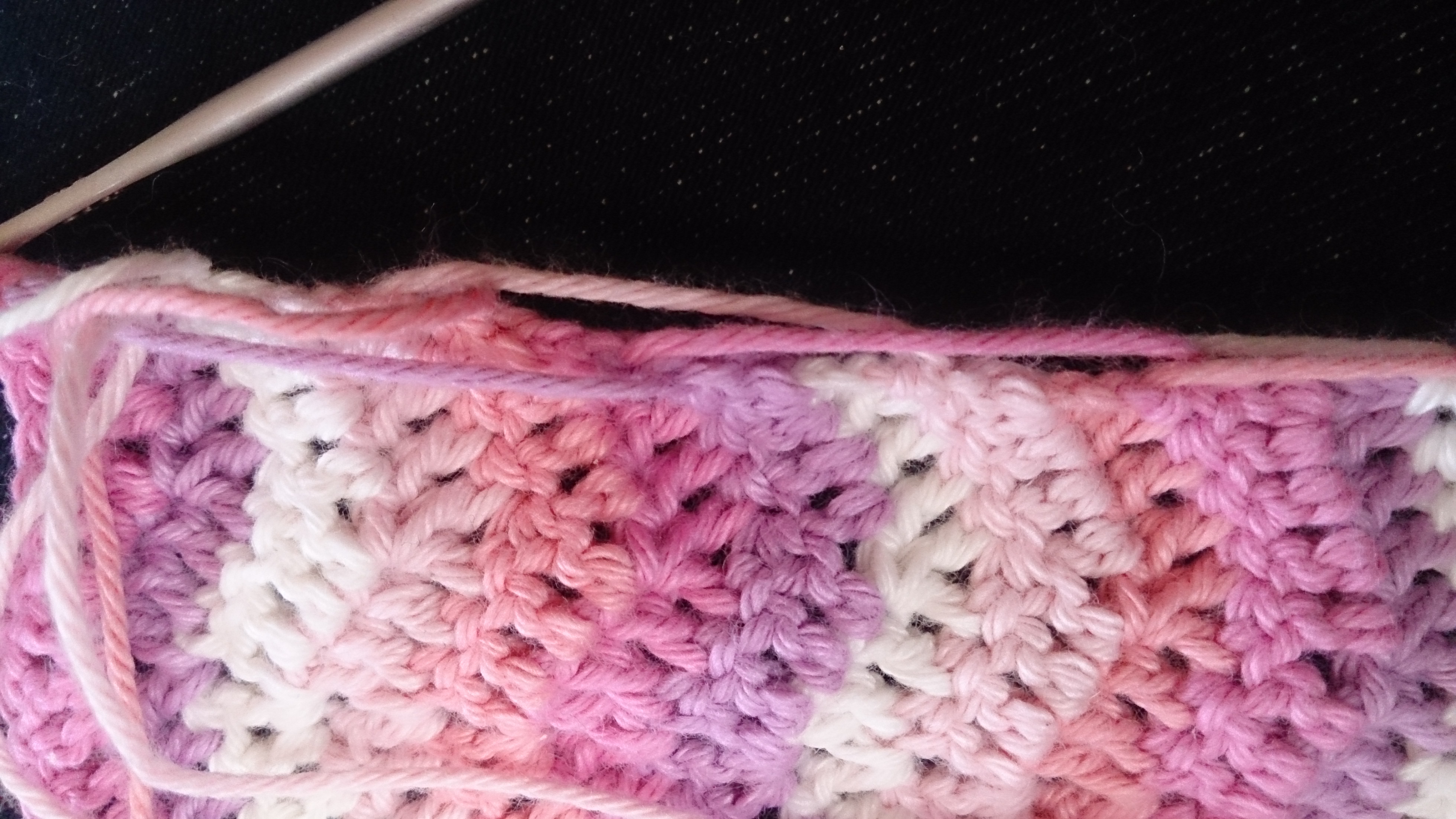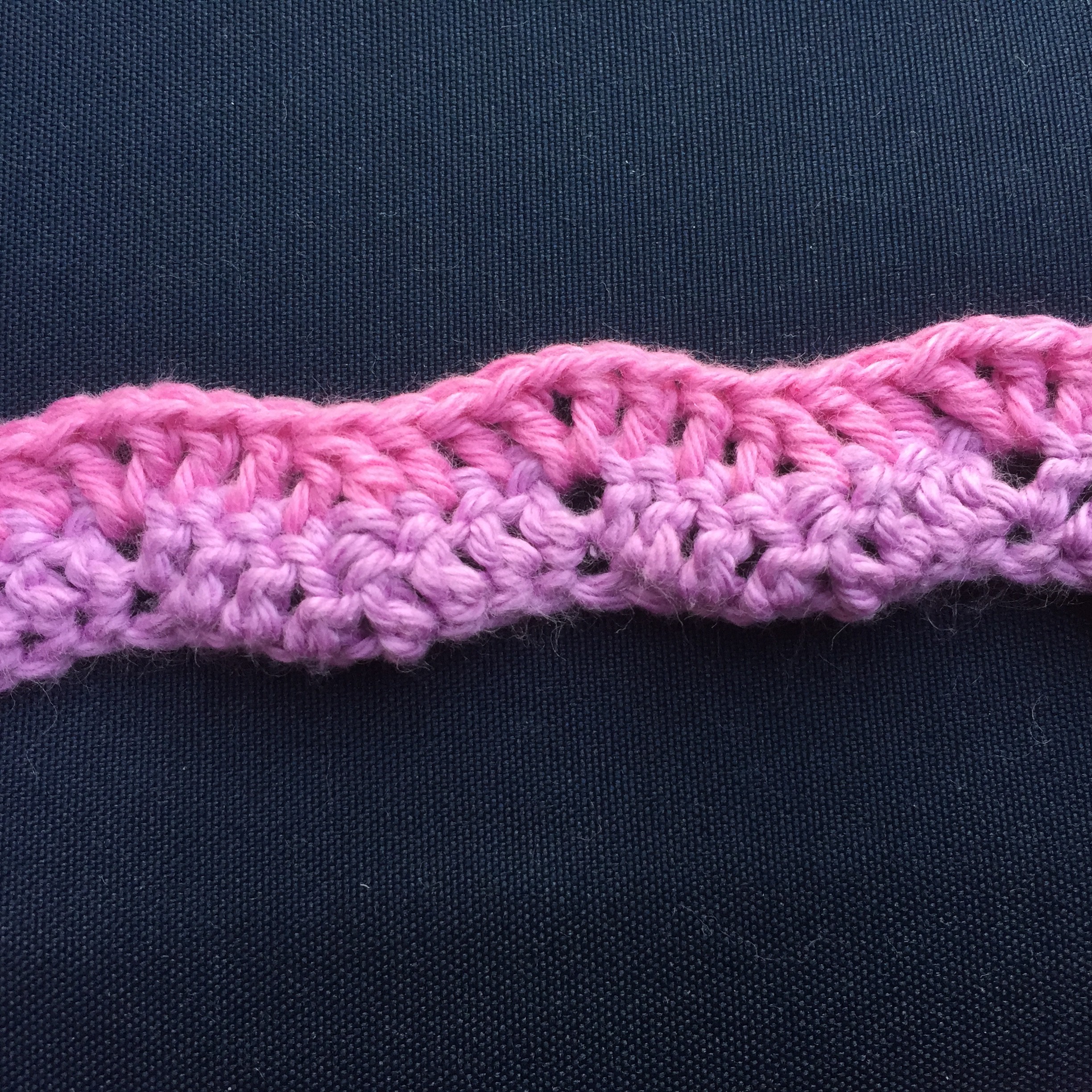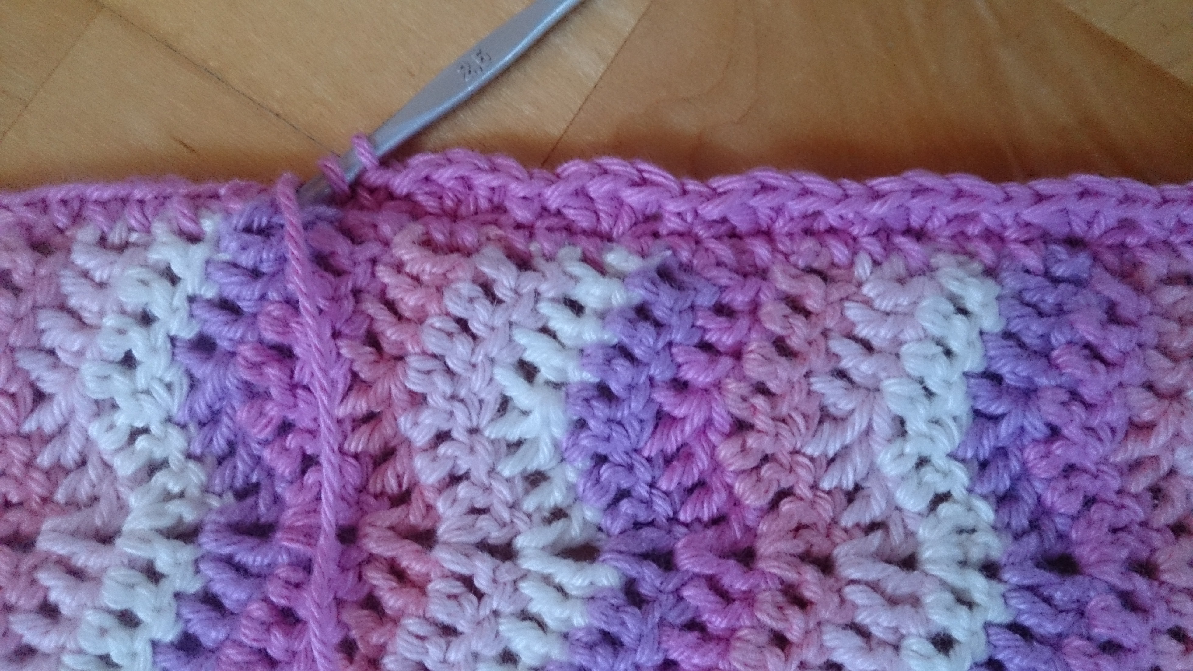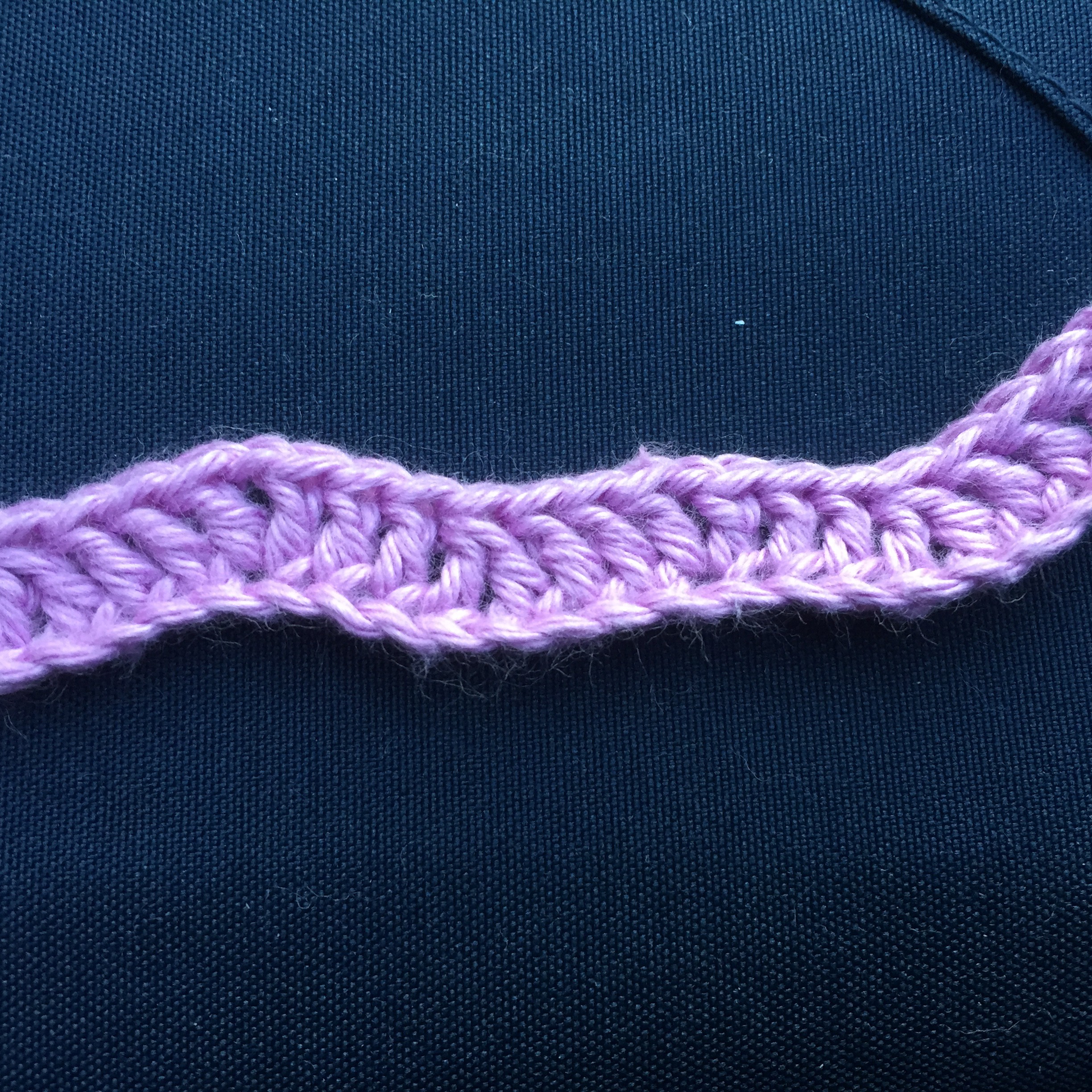 Jeg gjentok andre og tredje rad til arbeidet målte 186 cm. Garnet er ganske tjukt slik at fet gikk litt unna når jeg heklet.