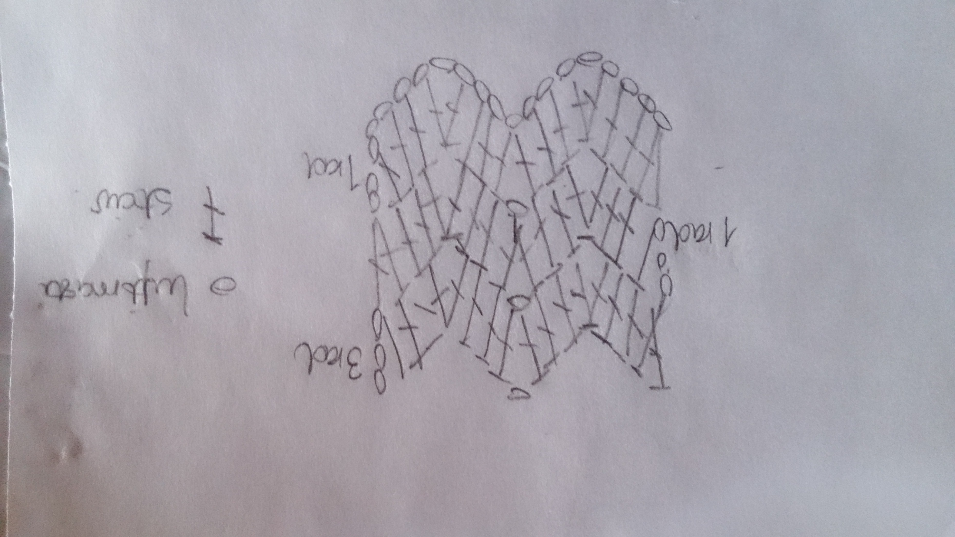 Her har jeg tegnet mønsteret hvor et kors betyr stav og en liggende sirkel betyr luftmaske og en liten t betyr fastmaske: