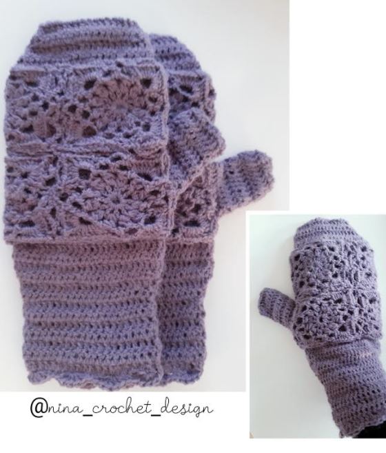 Now that it’s still winter These mittens are crocheted in Flora from Drops. It went with 2 nets of this yarn. The squares are sewn on the outside so that the mittens are warmer. I used crochet hook size 3.0 mm. And here is a collage with a picture of the finished mittens: