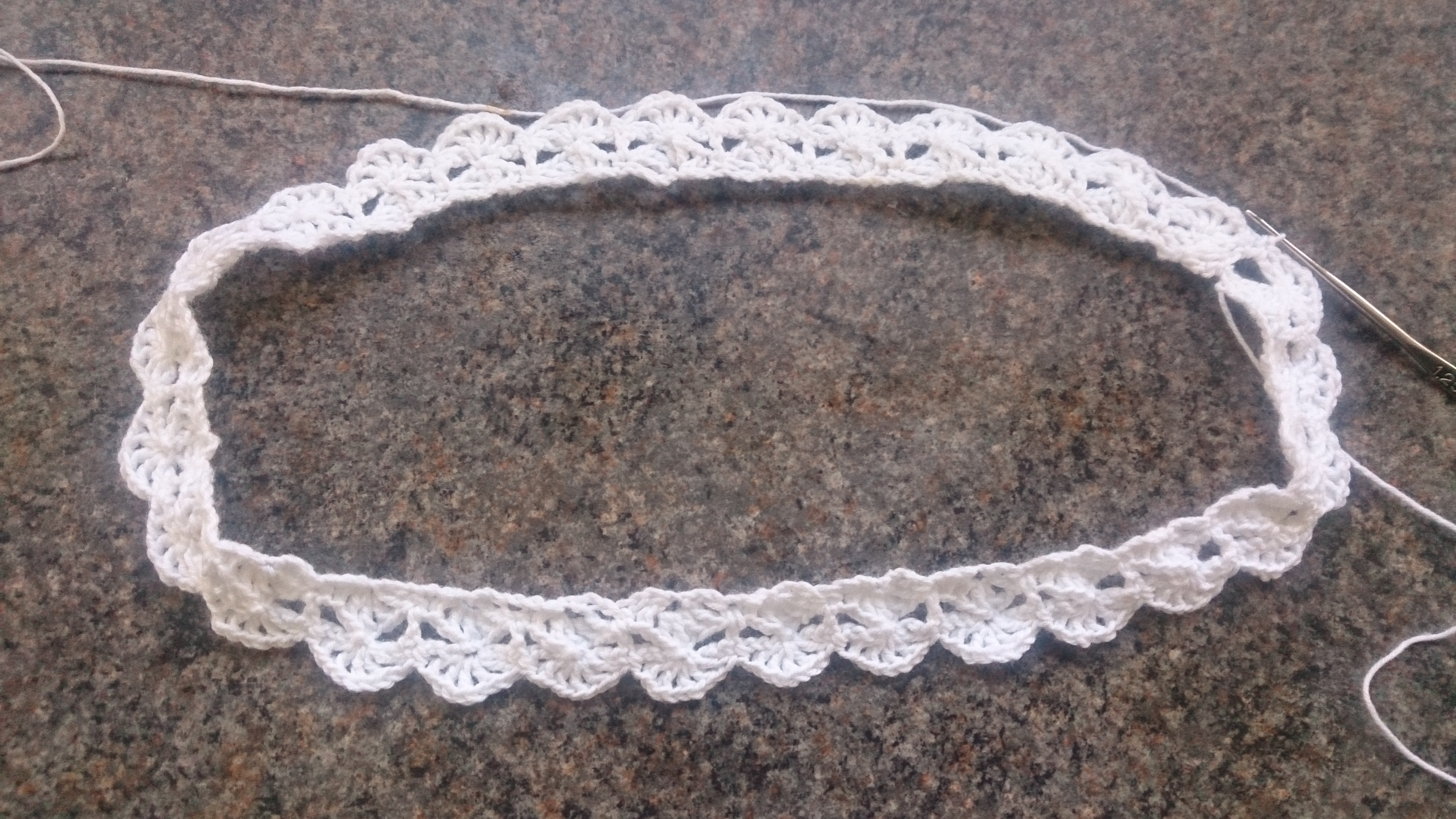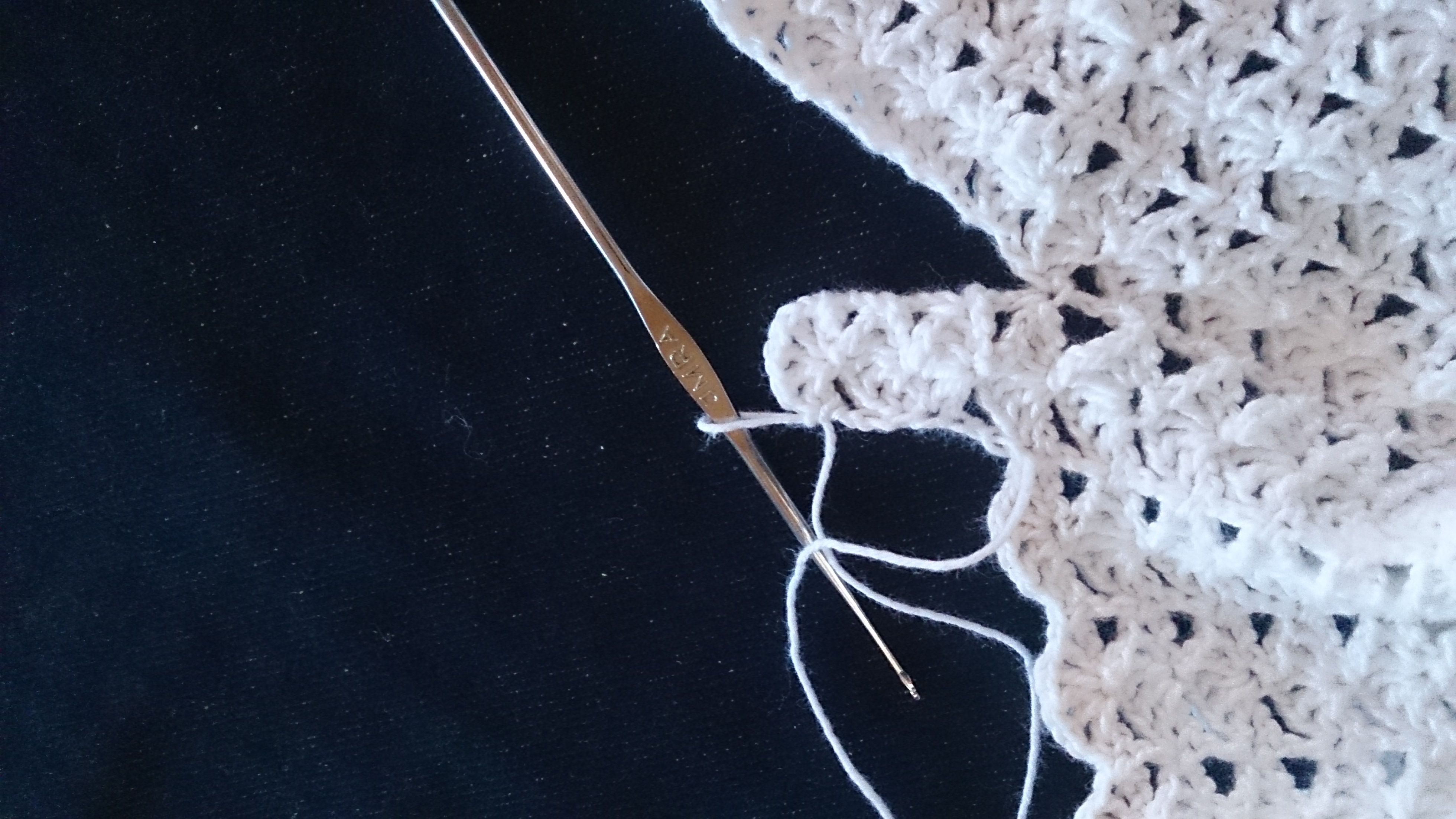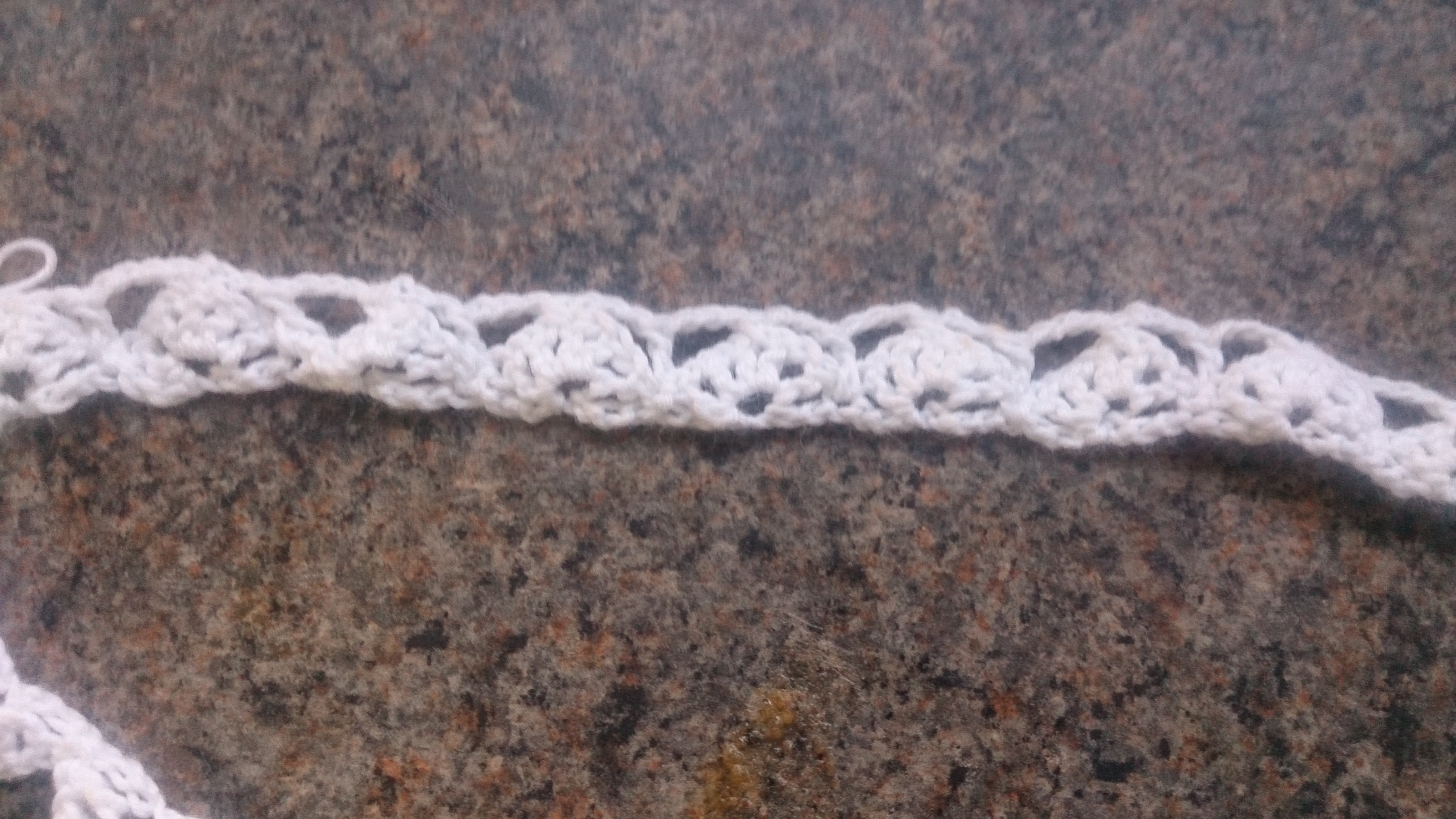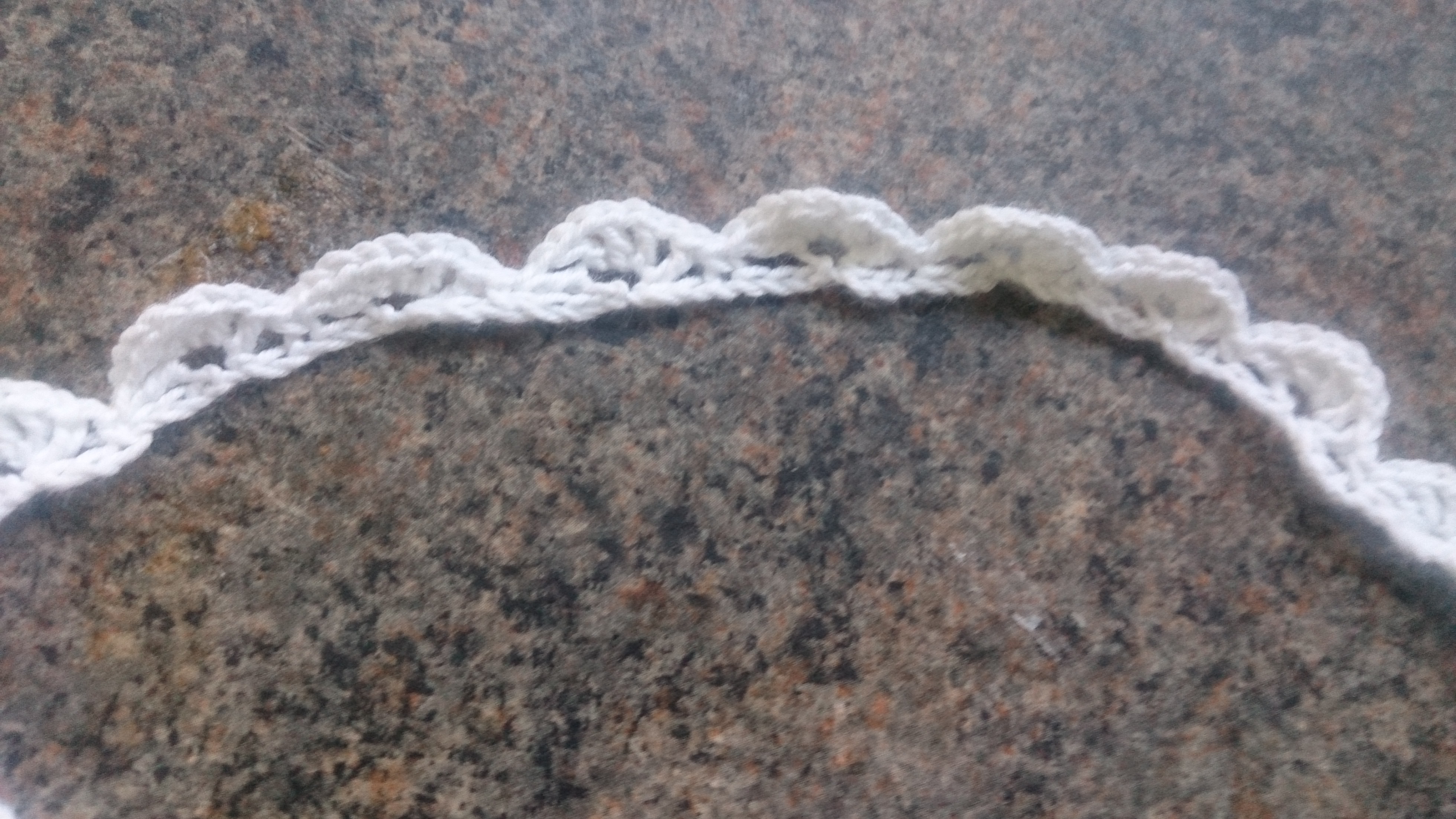 Andre rad: Jeg heklet 5 luftmasker, heklet 1 fastmaske i toppen av buen fra forrige rad. Der etter heklet jeg 3 luftmasker, 1 stav i fastmasken nederst mellom to buer, 3 luftmasker, 1 fastmaske i toppen av buen fra forrige rad. Dette gjentok jeg 28 ganger. Avsluttet raden med, at etter at 3 luftmasker er heklet etter toppen på buen fra forrige rad hekles den en fastmaske i buen fra starten av raden. Og her er et bilde som viser arbeidet etter andre rad:
