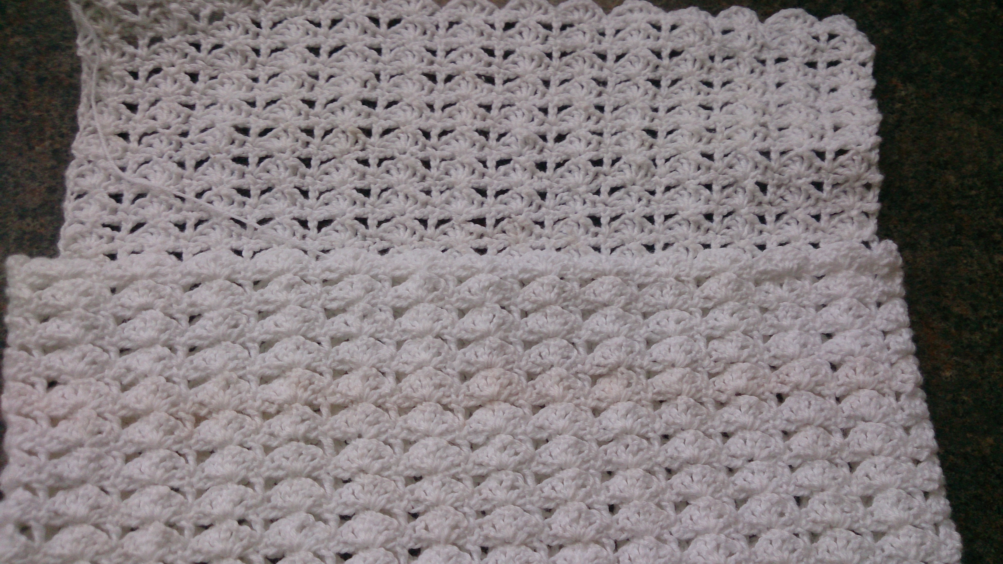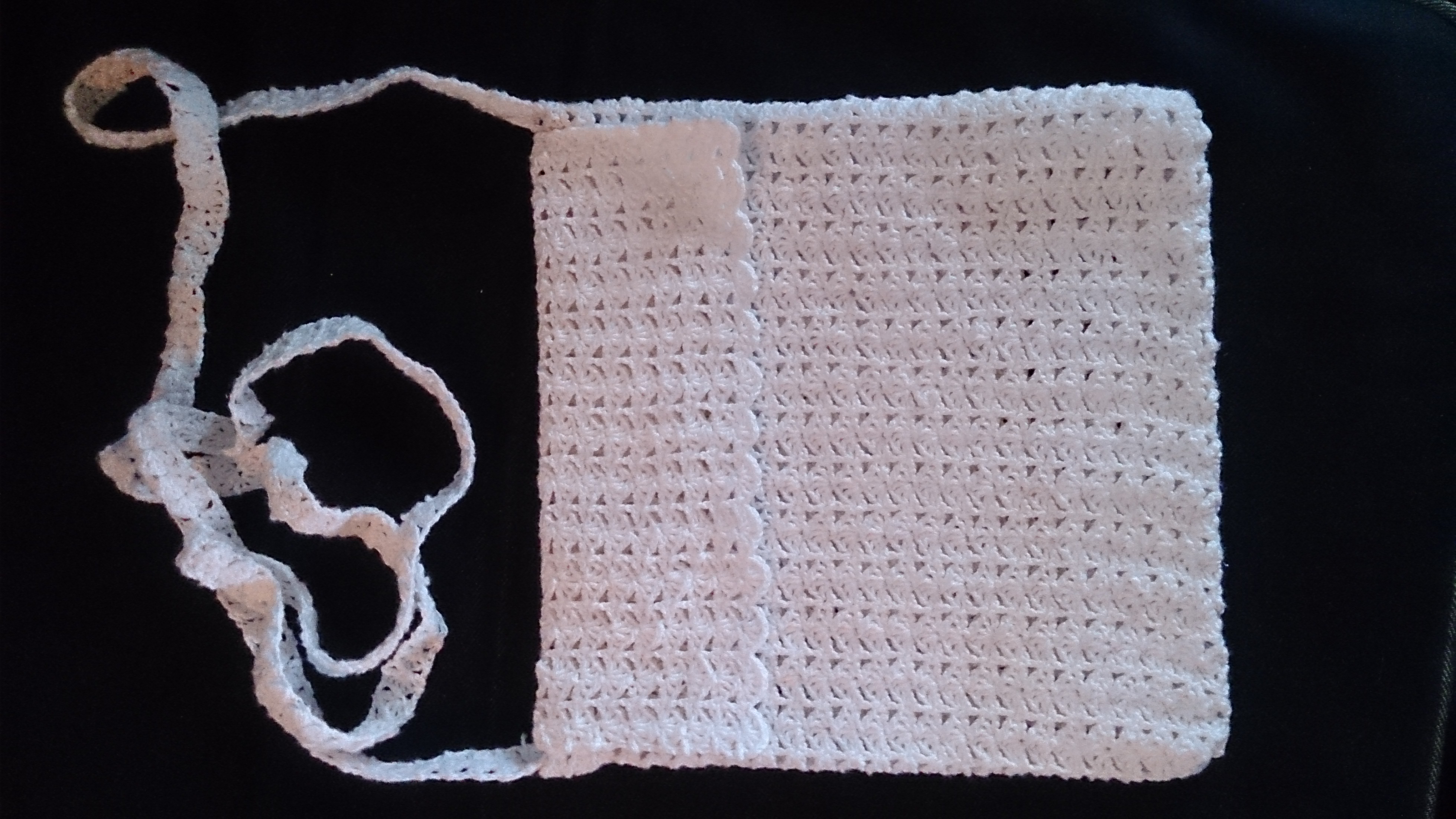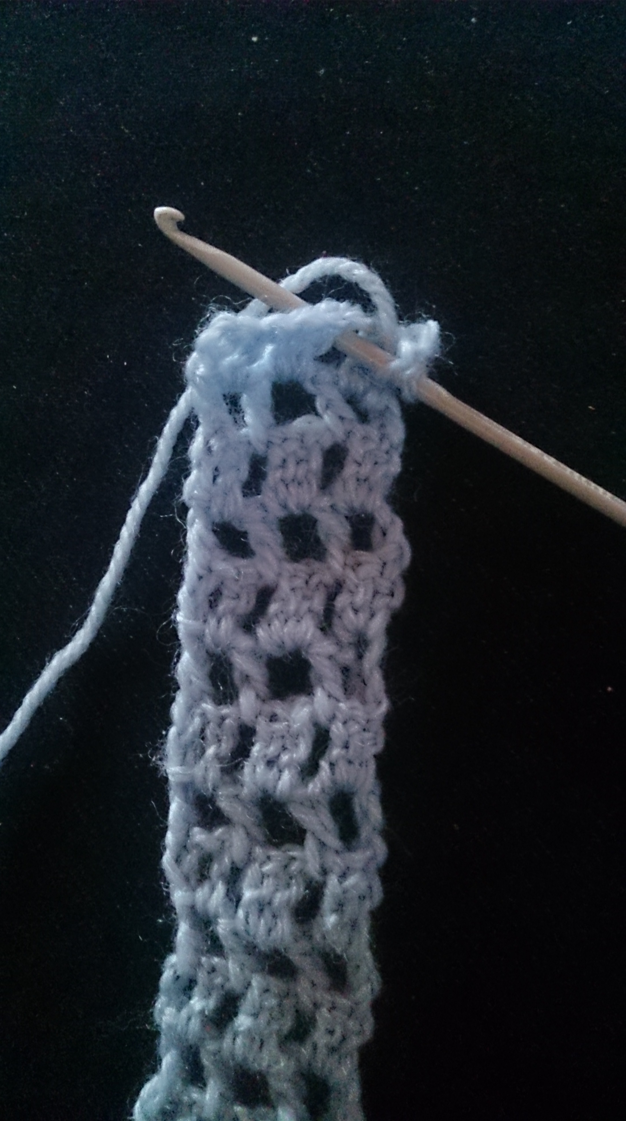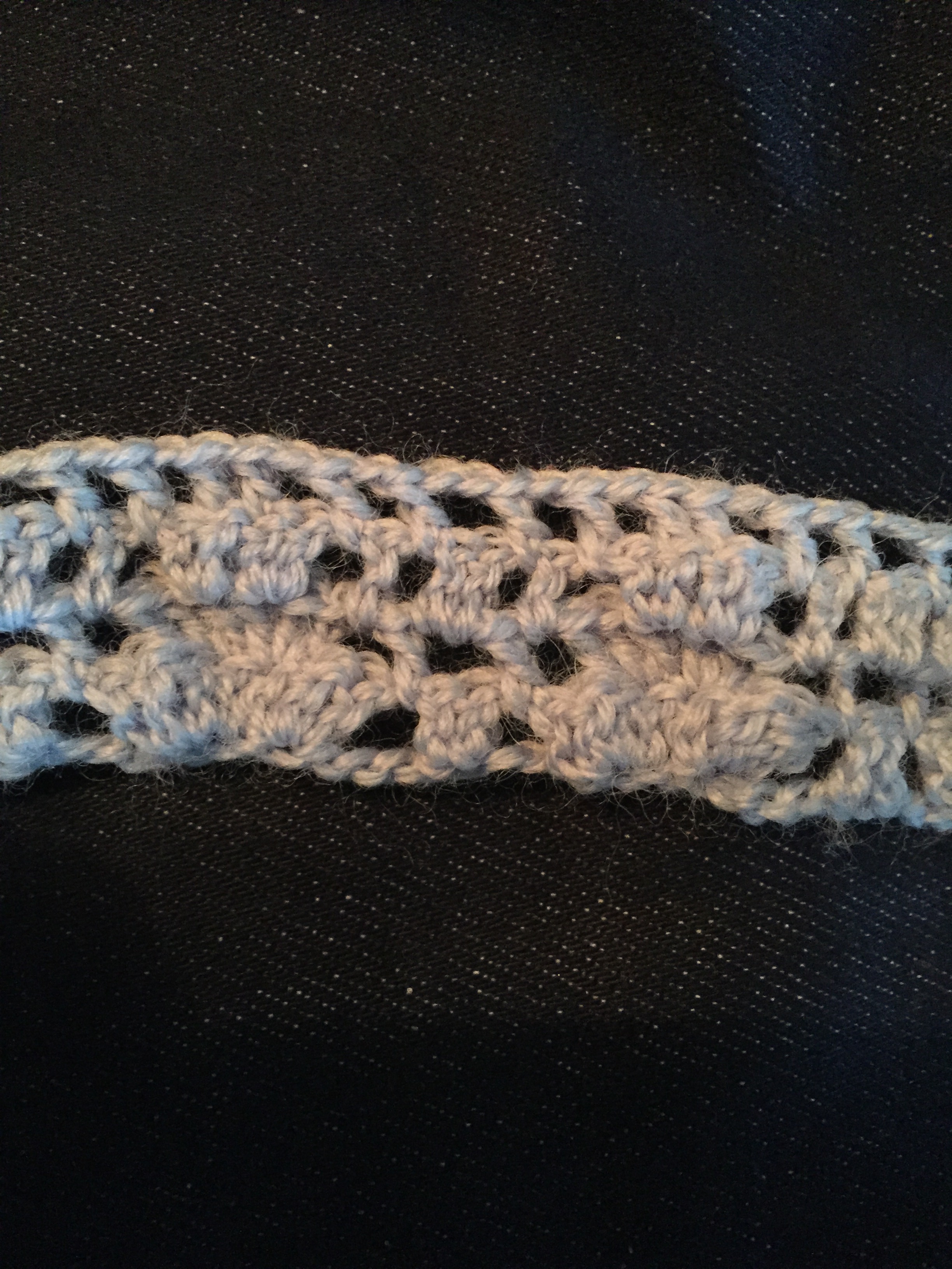 Første rad: Jeg hoppet over 5 første luftmaskene. Der etter heklet jeg 1 stav 1 luftmaske, 1 stav, 1 luftmaske, 1 stav 1 luftmaske, 1 stav 1 luftmaske, 1 stav 1 luftmaske i den neste luftmasken. Hoppet over 3 luftmasker og 1 fastmaske i den neste luftmasken. Dette gjentok jeg 28 ganger. Heklet sammen arbeidet ved at den siste fastmasken heklet jeg samtidig inn i kanten fra motsatt side slik at arbeidet ble rundt.