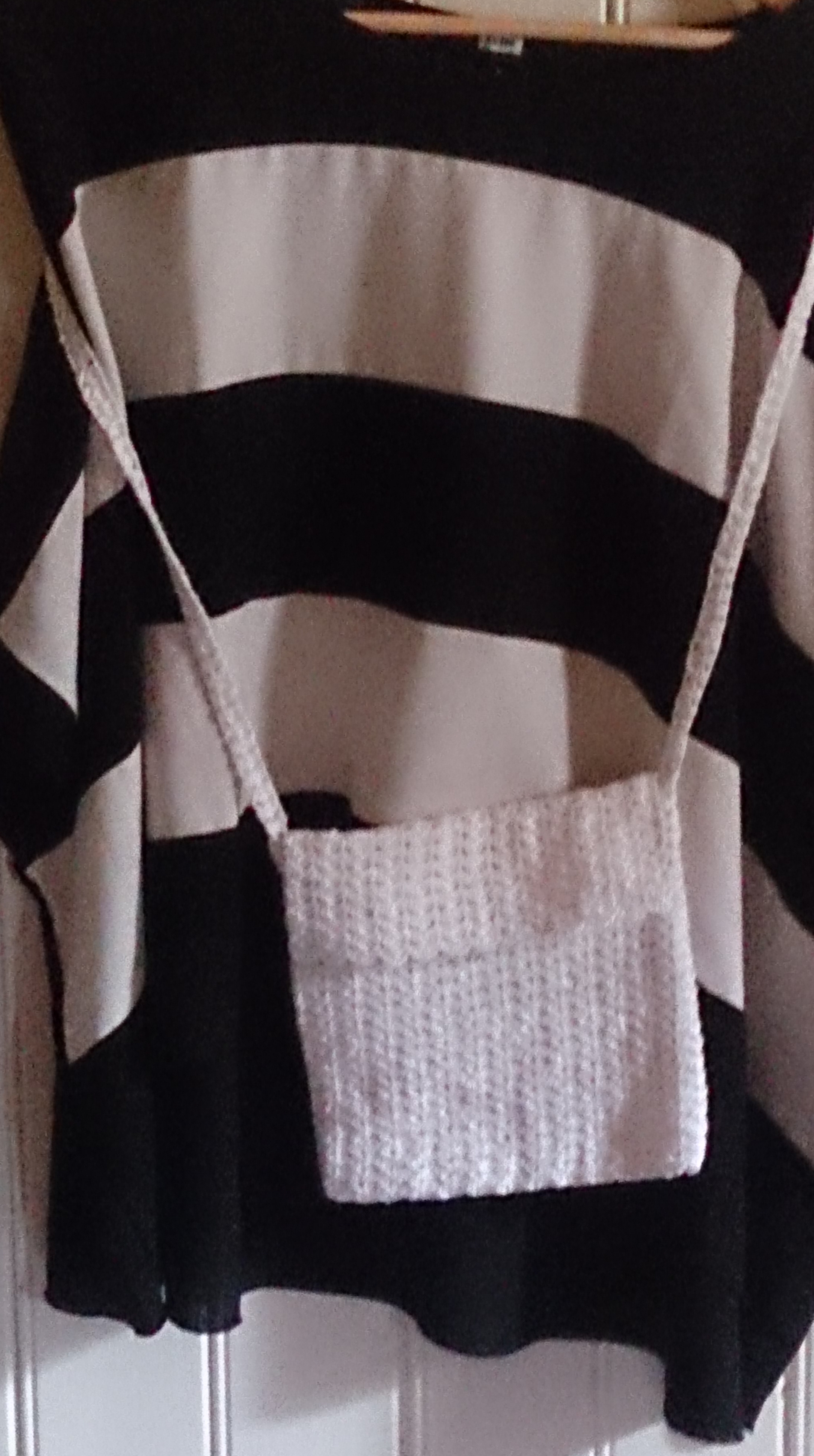 Vesken måtte jeg sy sammen i bunnen. Jeg passet på at jeg sydde fra vrangen med tråden fra starten av heklingen. Der etter festet jeg alle trådene. Det er helt unødvendig å stryke vesken. Jeg strekte «snoren» slik at den ble helt rett i kantene. Den andre anden av «snoren festet jeg med en sikkerhetslås slik at jeg kan variere hvor lang den skal være. For at vesken skal fungere mest mulig praktisk i bruk bruker jeg en lys mappe kjøpt på HM slik at nøkler og lebestiften ligger trygt i vesken. Og endelig her er vesken ferdig: