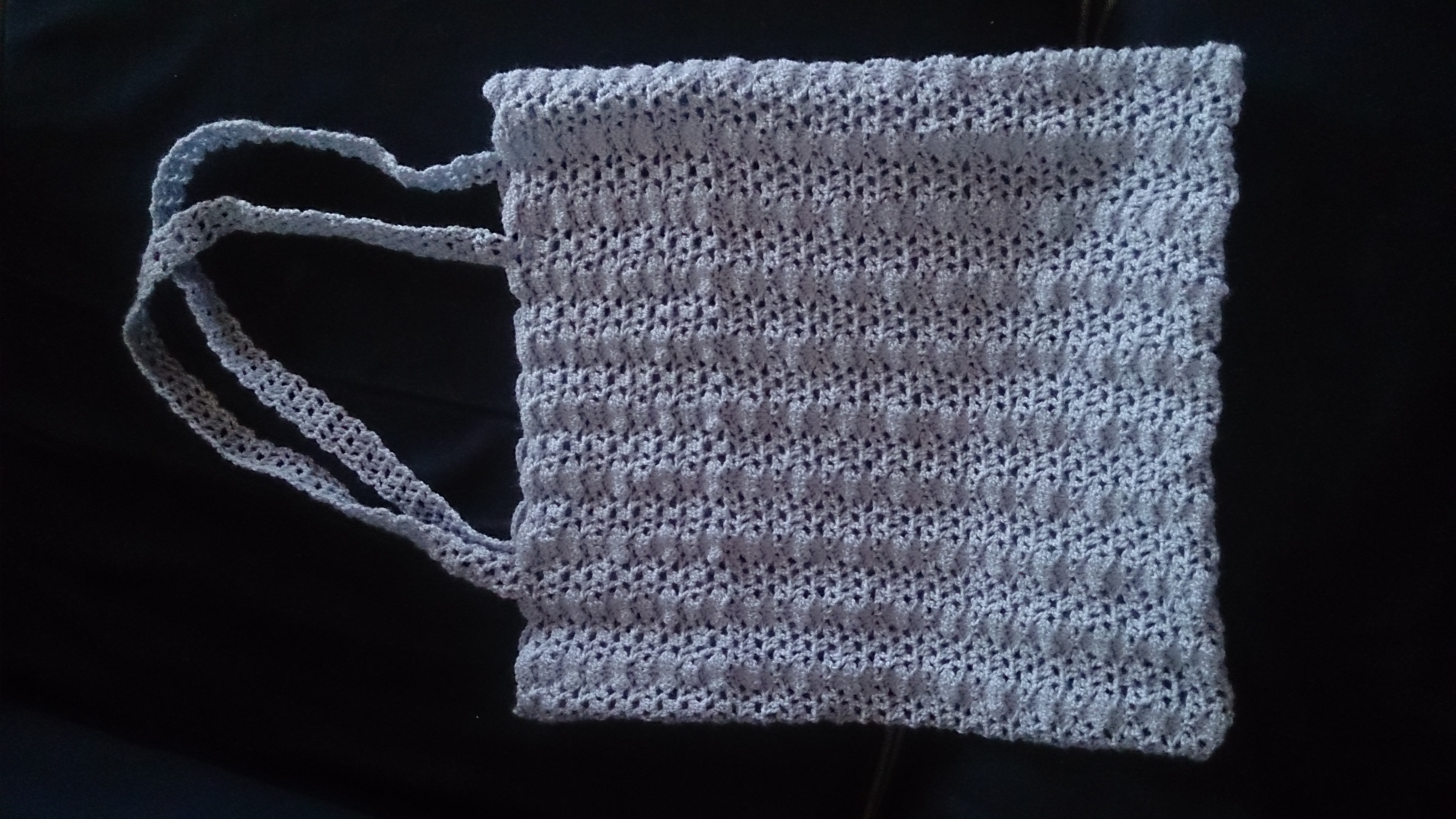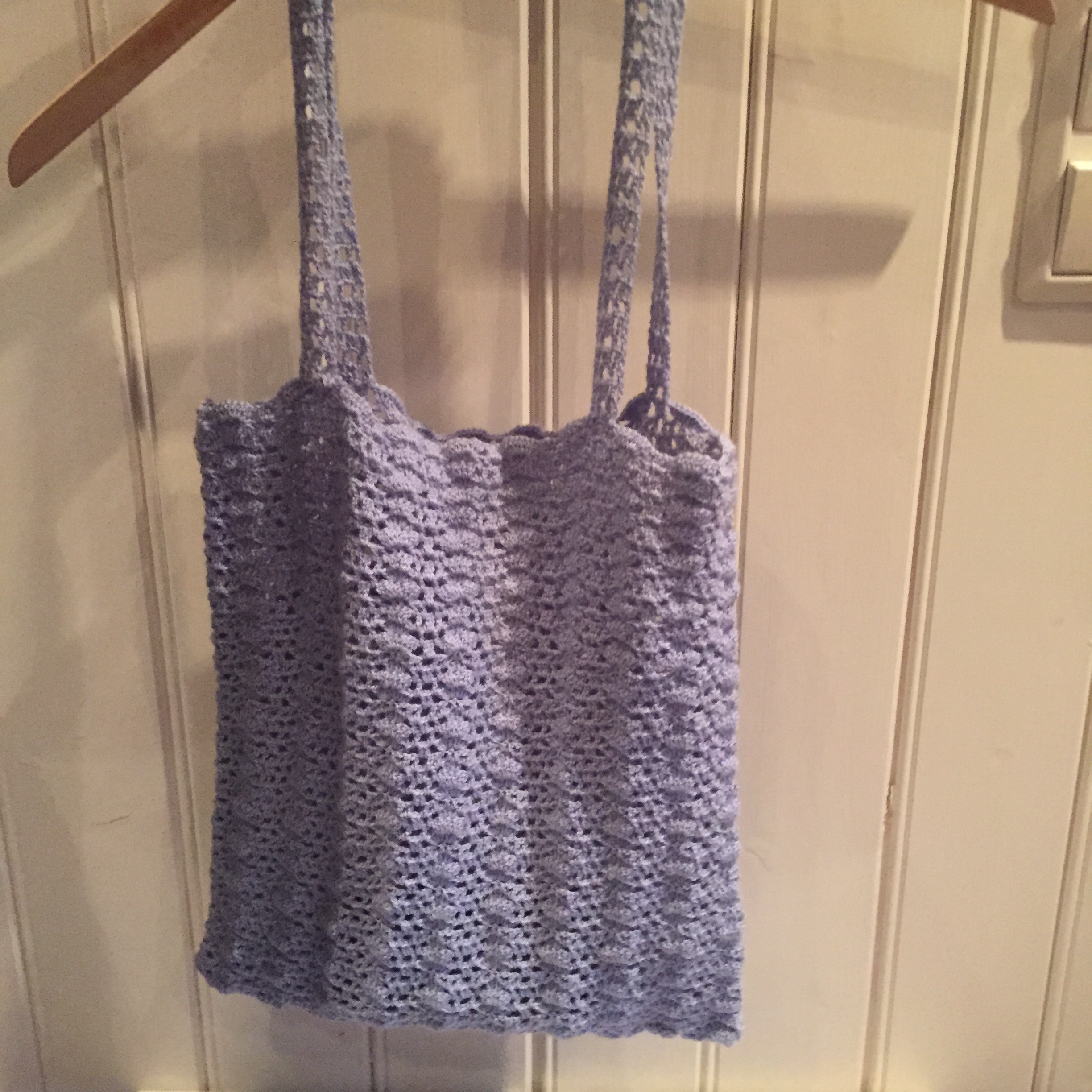 Denne vesken målte 21 cm i bredden og 21 cm i lengden. Garnet jeg benyttet var Solberg 12 4 fra Garnstudio. Det gikk med i underkant av 1 nøste til denne vesken. Det går fint an å bruke andre garntyper. Jeg brukte heklenål nr. 1,25. Mønsteret jeg brukes på denne vesken heter åpnet skjell mønster og dette gav en fin struktur i vesken.